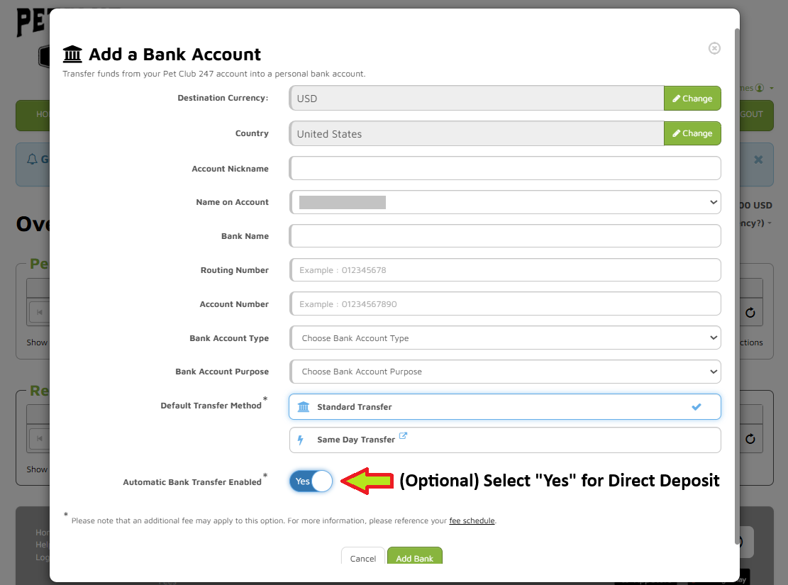 For Direct Deposit (Optional): You can choose to have your funds transferred to your bank automatically via Direct Deposit by switching the toggle to "Yes". Please note, there will be additional fees for this option.